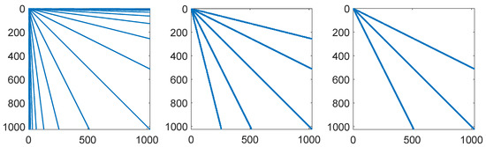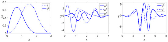 Therefore, if wavelets are defined as basis functions for the spaces , then the matrices in Equation (10) will be sparse. Figure 1 shows the cases , and , . The inner wavelet generators are defined by