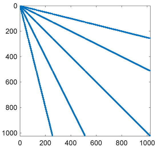 with defined by Equation (73). Then, the discretization matrix is the sum of the matrix and the matrix arising from discretization of the differential operator . Due to Theorem 5, many entries of the matrix are small and can be thresholded, and thus the matrix can be represented by a sparse matrix. The structure of the truncated matrix is presented in Figure 3. This matrix contains only entries larger than , and it was computed for the option with parameters from Example 1 and the wavelet basis from this paper containing eight levels of wavelets.