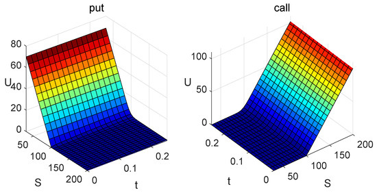 The method proposed in the previous section is used for the computation of the value of the put option and the put–call parity to compute the value of the call option. The resulting functions representing the values of the options are displayed in Figure 4.