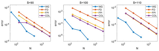 Figure 5 shows the pointwise errors for values of European options corresponding to the Merton model with the same parameters, in dependence on the spatial parameter N. In this figure, WG denotes the wavelet-Galerkin method combined with the Crank–Nicolson scheme with Richardson extrapolation as discussed in this paper, FD denotes the finite difference method from [21], FPI denotes the method from [19], which is based on fixed point iterations and the Crank–Nicolson scheme, and IMEX denotes the explicit–implicit method from [20], which is a combination of the cubic spline collocation method and the backward difference method. The number of time steps is comparable or smaller for the present method than for the other methods (see Table 2 and numerical experiments in [19,20,21]). Other numerical methods for the Merton model can be found in [34,35,36,37,38,39]. In comparison with methods from [19,20,21], the spatial parameter N was significantly smaller for the present method and thus significantly smaller matrices are involved in the computation.