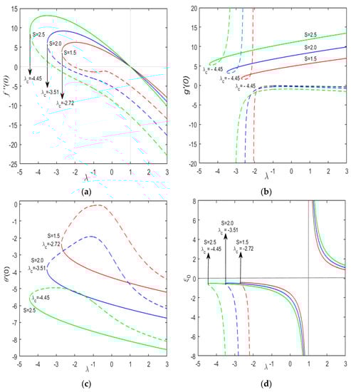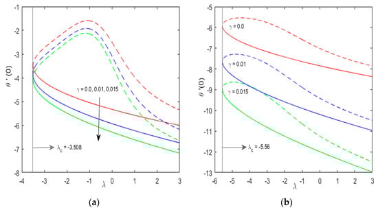 The results presented in Figure 3 leads to the behavior of for different suction and against and several values of thermal relaxation parameter γ when and It is notified from Figure 3 that the outcomes of magnifying values of thermal relaxation parameter leads to decrease of and vice versa. Since we have one way coupling of momentum equation and temperature equation, therefore, thermal relaxation parameter γ, does not influence the skin friction coefficient, also it has no effect on the critical values of stretching/shrinking parameter, i.e., , as seen in Figure 3.
