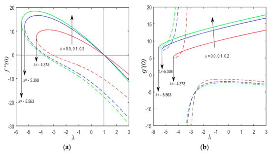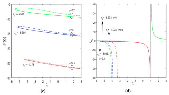 The impact of on both for stretching () and shrinking () surface have been respectively analyzed in Figure 1a,b. From these figures, we determine the critical values, , for stretching/shrinking parameter, , where we notice that there is no solution for , unique solution exists for and dual solutions for . The critical values appear in the shrinking region , whereas the dual solution exists in both stretching and shrinking domain, whenever, . Furthermore, from Figure 1a,b we can see that both and enhances for the first solution and declines for the second solution with enlarging values of mass suction Figure 1c,d respectively shows the behavior of and with respect to stretching/shrinking parameter, for distinct values of mass suction . From these figures, we decided that with the increase of suction parameter , both and decreases whereas the higher values of shrinking parameter, enlarges both and . Also, increases the range of critical values for , i.e., which means that mass suction increases the range of solution region. In Figure 2 again we have plotted , , over a stretching/shrinking surface , for individual values of nanoparticles volume fraction, . and fixed values of and . From these plots, we found that and increases as nanoparticles volume fraction increases. Moreover, increment of supports the improvement of both . Also, increases the range of critical values i.e., , which means that increases the range of stretching/shrinking where solution exist.