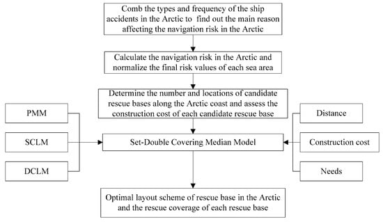 Overall, the objectives of this study were to (1) construct a new model to select the location of a rescue base, and (2) provide the optimal layout of rescue bases in the Arctic. The study is organized as follows: Section 2 introduces the technical process and modeling idea of this study. Section 3 describes the methods and results of the risk assessment for navigation in the Arctic. Section 4 presents the candidate rescue bases and estimation of their construction costs. The results are provided in Section 5 and the final section (Section 6) provides the conclusions and discussion.