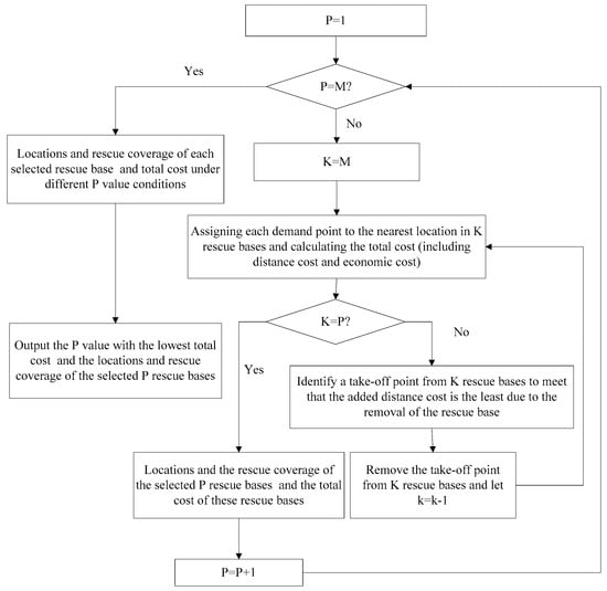 Many scholars have proposed models for allocating rescue bases; however many of them have focused on allocating rescue bases inland with fewer in coastal areas []. In 1826, Von Thünen [] wrote the book titled, “The Isolated State”, which is regarded as the first study on the site-selection problem. The constructed model uses distance as a constraint to analyze the interaction between cities and land use, and explains the phenomenon of agricultural areas around cities. In 1909, Weber [] addressed the industrial location problem. He investigated choosing the location of a warehouse so as to minimize the total distance between the warehouse and the customer. From then on, the problem of industrial layout was called the Weber problem. In 1964, Hakimi [] wrote a paper on the P-Centre Model (PCM) for solving the challenge of minimizing the maximum distance between P facilities and all demand locations, which marked the beginning of modern theory on site selection. Drezner and Wesolowsky [] proposed an algorithm to solve the PCM, which involved the numerical integration of ordinary differential equations and was computationally superior to methods using nonlinear programming. In 1965, Hakimi [] proposed the P-Median Model (PMM) to minimize the product of the distance from P facilities to all demand points, and the demand of the demand points. Goldman [] proposed an algorithm to solve the PMM with one server, which was based on a reduction procedure that may also yield useful simplification of problems involving general networks. Considering that solving the model with many servers needs too much computation, greedy algorithm is the most commonly used method to solve the model. Although the algorithm cannot guarantee that the obtained solution is the optimum solution, it can guarantee that the obtained solution is a satisfactory solution for policymakers [].