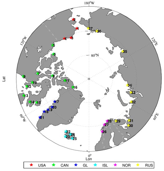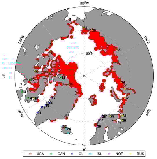 The candidate rescue bases selected in this study were required to meet two conditions: (1) the locations of the candidate rescue bases should be north of 60° N and along the Arctic Ocean; (2) the candidate rescue bases should be cities or towns with airports, ports, and hospitals. If there were no cities or towns meeting the facility conditions in a large area, priority was given to the cities and towns with airports. A total of 37 cities and towns were selected to be the candidate rescue bases in the Arctic and the details of these candidate rescue bases are shown in Table 7. Figure 5 shows the distribution of these candidate locations. All the data shown in Table 7 were obtained from Wikipedia.