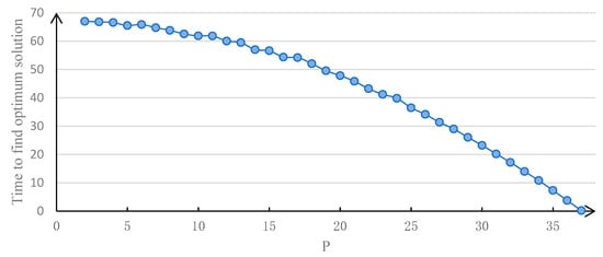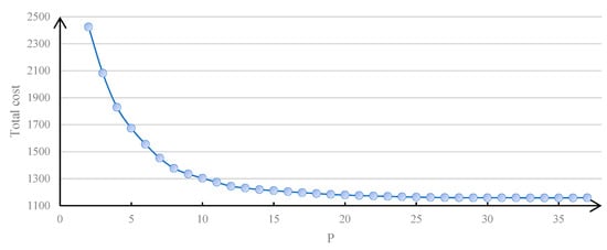 Since the greedy algorithm is a local search algorithm and the result of each iteration is to find the local optimal solution, the final result of the greedy algorithm is likely to be the local optimal solution. At the same time, when using the greedy algorithm to solve the model constructed here, this paper assumed that all candidate bases were selected as the final result first, and then removed the candidate bases one by one, which minimized the added cost in each iteration until the number of remaining bases equaled the number of bases that needed be built (Figure 2). Therefore, the convergence speed of the greedy algorithm to solve the model depended on the number of bases that needed be built, which was the value of P. The time needed to obtain the optimal solution using the greedy algorithm with different P is shown in Figure 6. This shows that the calculation speed of the greedy algorithm is very fast, although it cannot guarantee that the obtained solution is the best solution. Note that the central processing unit of the computer used was i3-3227U (Intel Corporation, Santa Clara, CA, USA) and the random access memory capacity of the computer was 4G. The calculation is based on MATLAB 2104a software (MathWorks, Natick, MA, USA).