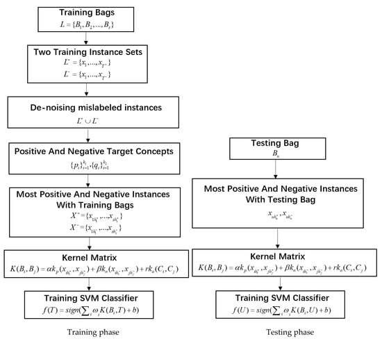 The basic steps of the MILDMS are illustrated in Figure 1, where each block represents an object to operate on and each arrow indicates an operation defined on the objects. In the training phase, we first learn the positive and negative concepts, also called Target concept locating, though a two-step inverse DD optimization model. After doing this, we perform the de-noising process and obtain one most positive and negative instance per bag through selecting the nearest instance within the bag to positive and negative target concepts, and hence the instances in the bag are split into three parts, the most positive and negative instances, and other instances. Next, we construct three kernels for positive instance, negative instance, and other instances separately, which can be combined together with multiple kernels to construct a new MIL kernel and train the SVM model. While in the testing phase, as done in the training process, we take a similar way to construct the MIL kernel using selected positive, negative, and other instances, and finally adopt the trained SVM to predict the unknown bag’s label.