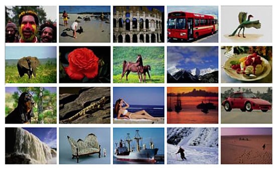 In addition, we also applied our MILDMS to an image classification task dataset COREL, which contains 20 categories, including Africa people and villages, Beaches, Historical buildings, Buses, Dinosaurs, Elephants, Flowers, Horses, Mountains and glaciers, Food, Dogs, Lizards, Fashion models, Sunset scenes, Cars, Waterfalls, Antique furniture, Battle ships, Skiing, and Desserts. In the dataset, the total 2000 images were divided into 20 distinct categories, where each category contains 100 images. We selected one sample image from each of the 20 categories and display them in Figure 3. The categories are ordered in a row-wise manner from the upper-leftmost image (Africa people and villages) to the lower-rightmost image (Desserts).