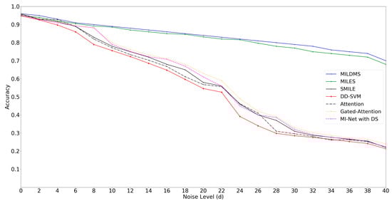 As shown in Figure 4, our MILDMS is more robust than DD-SVM and SMILE in high noise level, for our method is modeled in positive and negative instance space separately. It is worth noticing that our MILDMS algorithm achieves equal performance when comparing with MILES, and outperforms deep MIL methods including Attention and Gated-Attention [25], and MI-Net with DS [24].