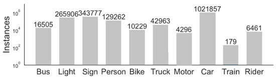 Berkeley University, BDD100K. The BDD100K asymmetry dataset contains 100,000 segments of HD video. Each video is about 40 s, 720 p, 30 fps [12]. The key frame is sampled in the 10th second of each video to get 100,000 images (image size: 1280 × 720). There are 10 categories of labels in the dataset: Bus, light, sign, person, bike, truck, motor, car, train and rider. There are about 1.84 million calibration frames in total, and the number of different types of targets is shown in Figure 3.