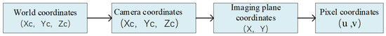 According to the camera mathematical model [24,25], the machine vision maps the scene projection in the three-dimensional world and coordinates to the pixel value of the two-dimensional gray matrix using the cooperative symbol fixed by the geometric dimension. The most common phenomenon is the pinhole camera model. The conversion process is shown in Figure 5 below.
