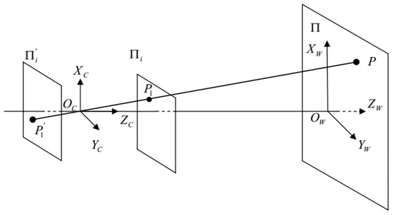 In Figure 6, is the optical center of the camera, which is the origin of the camera coordinate system. The axis is parallel to the optical axis of the camera. The direction of each coordinate axis is as shown. In the camera coordinate system, assume that the coordinates of a point are . The projection point of point P on the imaging plane is , f is the focal length of the camera and the formula for the conversion relationship is as follows.