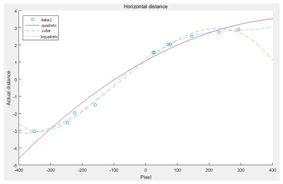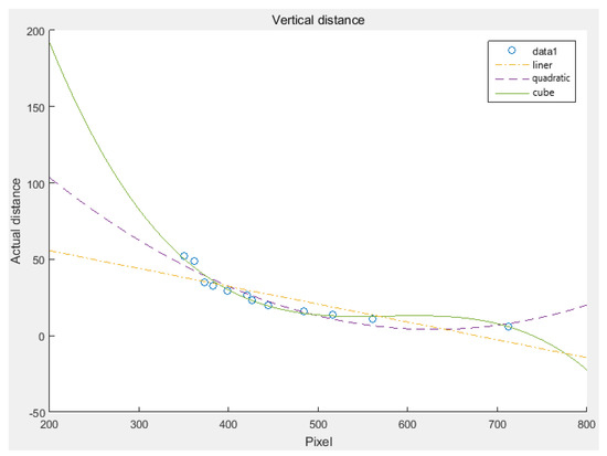 In the coordinate system, the position of the vehicle in the image is the abscissa. The actual distance from the camera to the vehicle is the ordinate, and the corresponding data points are drawn. In this coordinate system, the data points are seperately subjected to different forms of polynomial fitting and curve fitting, which mainly includes quadratic fitting, cubic fitting and quadratic fitting of the polynomial. The fitting curves are shown in Figure 8 and Figure 9.