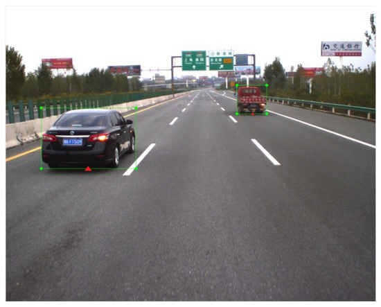 The monocular vision vehicle ranging method can be divided into the following four categories. The first is based on the imaging model method, and the literature [18] uses the vehicle width to measure the vehicle distance. This method requires the actual width of the known vehicle and the width of different vehicles. The width of different vehicles varies from 1.4 m to 2.6 m; if the actual width of the vehicle is unknown in advance, it will cause a large ranging error. The authors of [19] use the position of the vehicle in the image to measure the distance of the vehicle. This method needs to accurately obtain the position of the vehicle in the image, otherwise it will generate a large ranging error. The second is a method based on geometric relations.To achieve vehicle ranging, the literature [20] uses the geometric positional relationship of the vehicle in the imaging model to derive the correspondence between the image coordinate system and the world coordinate system. This type of method requires accurate measurement of the camera’s viewing angle and pitch angle, otherwise the accuracy of the range is greatly reduced, and it is difficult to accurately measure the pitch angle for a camera on a moving vehicle. The third is based on mathematical regression modeling. For example, the literature [21] uses the correspondence between different reference distances and their positions in the image to calculate the regression model to measure the distance. This method requires a large amount of up-front data acquisition, analysis and calculation of mathematical models. The fourth is based on machine learning methods, and the literature [22] proposes a forward vehicle detection method that combines machine learning with prior knowledge. Vehicle candidate regions are extracted by using MB–LBP (multiscale block–local binary pattern) and Adaboost [23], and the vehicle is false detected based on the horizontal edges and grayscale features in the candidate regions. In addition, based on the vehicle detection, the improved vehicle bottom shadow positioning method is used to obtain the accurate position of the vehicle, and the vehicle distance measurement is realized by the position information imaging model method.
