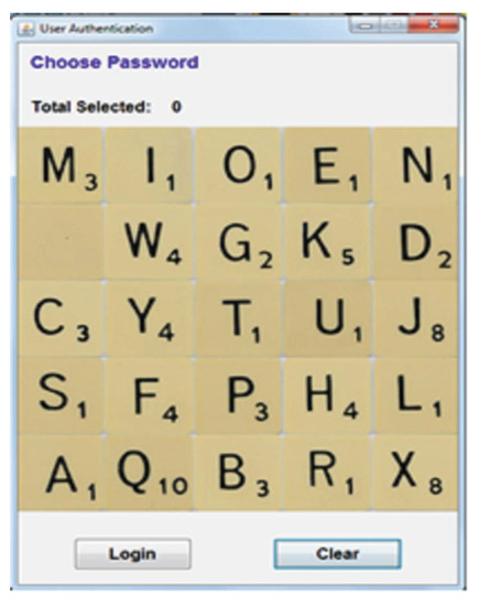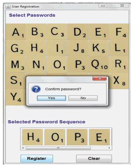 The proposed system is inspired by a word game named Scrabble. The user is given 27 images (starting from the character A to the character Z, together with a “blank” block). For the proposed shoulder-surfing prevention method to work properly, the user needs to register at least two images. The user is allowed to register the same image more than once. However, the user can only register up to 25 unique images due to the maximum size of the grid cell (5 × 5), which has been fixed during the password verification process. The registration procedure is considered completed once the user has confirmed the registered images (see Figure 1). After confirmation, the system initials the user’s account status as “new”. Lastly, the information regarding the registered images and the account status of the user is stored in a file system.