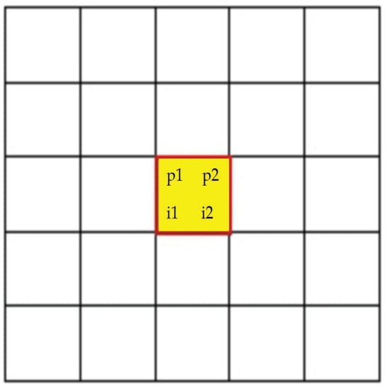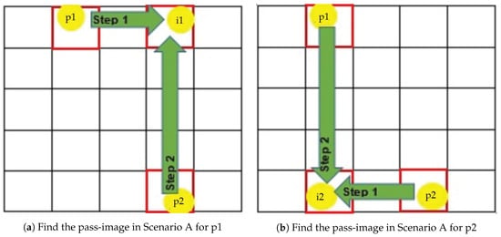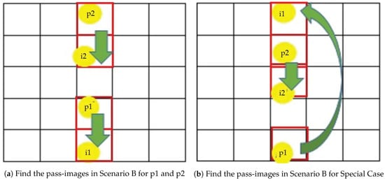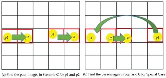 The location of the pass-images can be determined using Equations (7)–(10). Equation (7) is used when p1 is located at the right edge of the row. In this special case, the pass-image for p2 can be determined using Equation (10). If p2, the second registered image, is located at the right edge of the row, the pass-image for p2 can be determined using Equation (8). In this special case, the pass-image for p1 can be determined using Equation (9). For normal cases, Equations (9) and (10) are used to determine i1 and i2 respectively.