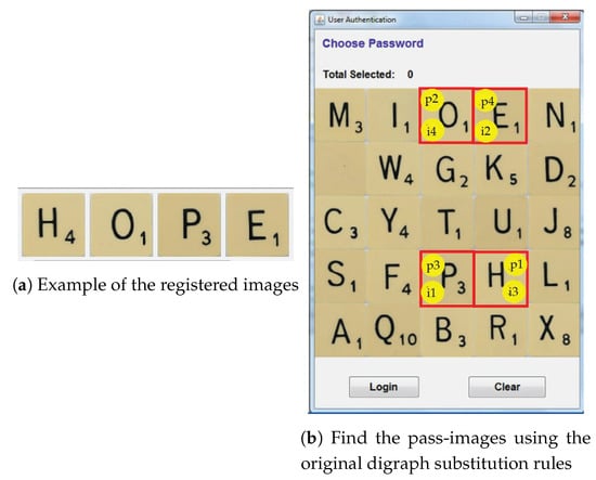 Assume that a user has registered the same images as in Figure 7a. To obtain i1 using our new proposed method, p1 and p2 are used (see Equation (12), when n = 1). In Scenario A, i1 can be determined using the digraph substitution rule.