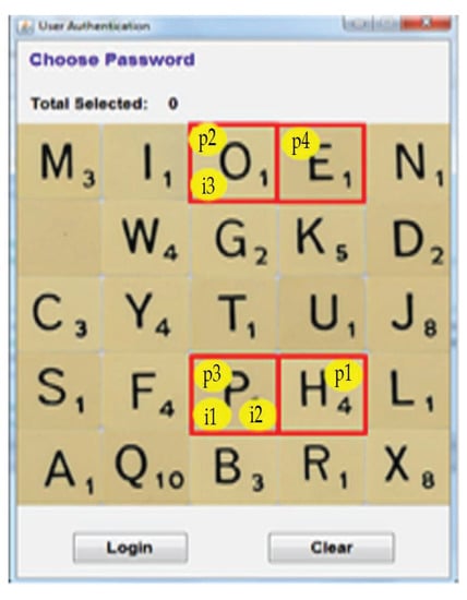 However, i2 can no longer be determined using p2 and p1 in this proposed method. To determine the next pass-image (i2), the next registered image (p3) and the current pass-image information (i1) are used (see Equation (12), when n = 2). By modifying the original method for determining i2, an attacker is prevented from obtaining full knowledge of the registered images used. By using this proposed method, a shoulder-surfer is no longer able to identify the pass-images used based on the digraph substitution rules because p2 not associated with i2 (see Figure 8).