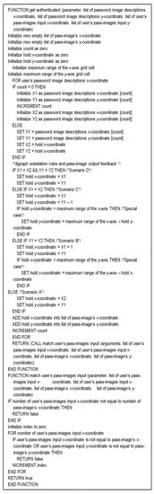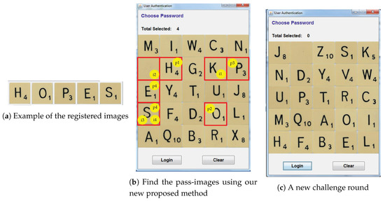 Figure 9 shows a sample challenge round to illustrate the proposed modified method for identifying pass-images. Assume that a user has registered the images as in Figure 9a. To obtain i1, p1 and p2 are used. As p1 and p2 appear to be diagonal to each other (Scenario A), the user needs to determine i1 by locating the intersection image of the first password image’s row and the second password image’s column (see Equation (1)). The user is then required to find i2 using p3 and i1. As both p3 and i1 appear on the same horizontal vector, to determine i2, the user can use the special case rule in Scenario C (see Equation (9)). After obtaining i2, the user is required to find i3 using p4 and i2. As p4 and i2 appear on the same vertical vector, to determine i3, the user can use the rule in Scenario B (see Equation (3)). To identify i4, the user is required to use p5 and i3. As p5 and i3 appear at the same location, to determine i4, the user can use the rule in Scenario D (see Equation (11)). The user is required to correctly click all the pass-images (i1, i2, i3 and i4. To find the pass-image for p2) according to their sequence to gain access to the proposed system. If the user clicks the pass-images incorrectly, a brand-new set for a challenge round will be given (see Figure 9c). The pseudocode of the proposed algorithm is shown in Figure 10.