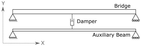 The model was constructed with the software ANSYS v17 (ANSYS Inc., Canonsburg, PA, USA). Both the deck of the bridge and the auxiliary beam were modelled as beam elements. In particular, we used the element BEAM188 provided by the program, which is based on Timoshenko beam theory with shear-deformation effects []. The number of elements was determined with a mesh sensitivity analysis, concluding that eleven elements (for each beam) were sufficient to produce consistent results. To model the damper, the element COMBIN14 was employed. The only value needed for this element was the damping coefficient. Given the symmetry of the model, the study was two-dimensional (in the plane containing both beams).
