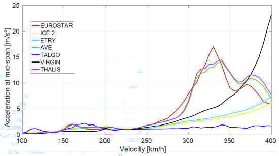 It can be seen that the train EUROSTAR 373/1 travelling at 330 km/h produces the biggest acceleration peak below 350 km/h. The Virgin train produces a greater acceleration value at 400 km/h; however, the evolution of this acceleration with velocity is smoother at lower speeds. Thus, the case study will be the EUROSTAR train at 330 km/h with the bridge-beam configuration described previously.