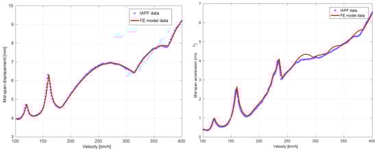 Maximum values for displacement (left) and acceleration (right) as a function of the speed of the train for the validation case provided in []. The reference values are plotted as asterisks.
