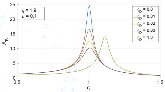 In order to crosscheck the implementation of the GA, a validation case must be solved. We took, as reference, the analytical optimization of an AB system proposed in []. In that reference, the authors obtained an analytical expression for a parameter related to the acceleration at the mid-span of the bridge (). Then, the value for the parameter related to the damping coefficient that minimizes was computed. The theoretical model proposed in the paper is given by: