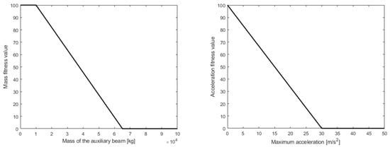 The specific definition of the fitness function (a function that maps the acceleration and added mass values to a scalar) is critical to the behaviour of the algorithm. We decided to unify both objectives in a single fitness value by first evaluating the results and mapping them to individual fitness values. The mapping of added mass and maximum acceleration is performed with the piecewise functions depicted in Figure 5. Bigger accelerations and masses are penalised with lower fitness values, saturating at certain unreasonable values.