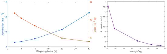 Influence of the weighting factor of the fitness function in maximum acceleration and added mass values (left). Relation between added mass and maximum acceleration (right). Increasing added mass (reduced weight factor for mass penalty) leads to decreasing acceleration. The rate of acceleration reduction is lower for bigger masses.