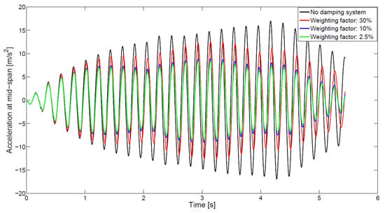 k being the flexural stiffness of the bridge and a Rayleigh coefficient that allows to define the damping matrix []. Only was used because the vibrations occur in the vicinity of the first natural frequency of the bridge, and was computed using such a frequency and the value of the structural damping coefficient (2% according to []). Furthermore, a comparative analysis (using both Rayleigh parameters and only ) provided identical acceleration responses over time, and the maximum value only differs for less than 0.7 percent. Then, these non-dimensional parameters are the variables to optimize in our study.
