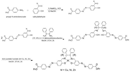 - Aritake, Y.; Takanashi, T.; Yamazaki, A.; Akitsu, T. Polarized spectroscopy and hybrid materials of chiral Schiff base Ni(II), Cu(II), Zn(II) complexes with included or separated azo-groups. Polyhedron 2011, 30, 886–894. [Google Scholar] [CrossRef]