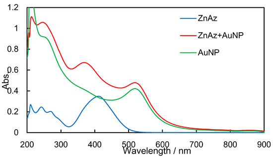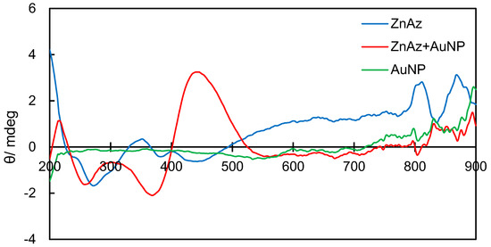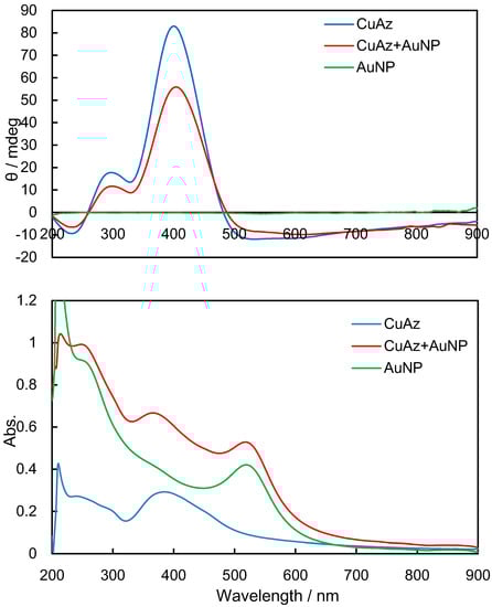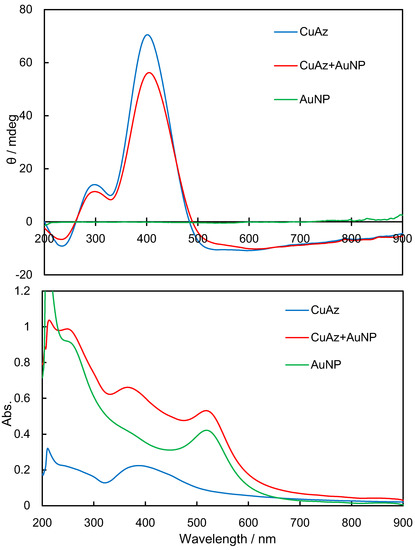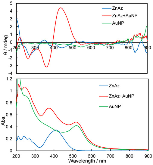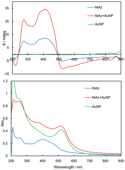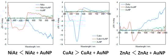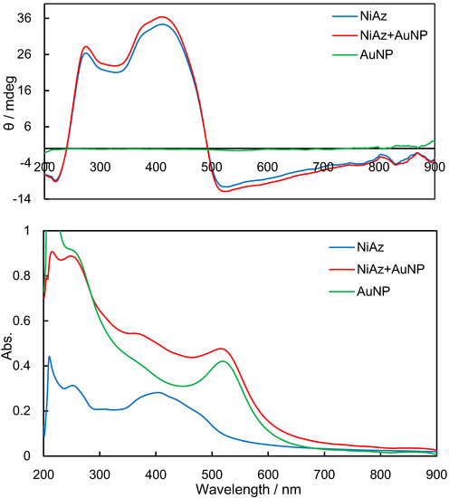 Figure 3, Figure 4 and Figure 5 exhibit experimental CD and UV-vis spectra before UV light irradiation for NiAz, CuAz, and ZnAz (and AuNP), respectively. For all UV-vis spectra, the surface plasmon peaks of AuNP were observed at 520 nm. As for NiAz (Figure 3), CD peaks appeared at 280 nm (π-π*) and 410 nm (n-π*), while UV-vis peaks appeared at 260 nm (π-π*) and 380 nm (n-π*). Broad and negative induced CD peaks were observed around 525 nm corresponding to the plasmon region. As for CuAz (Figure 4), CD peaks appeared at 300 nm (π-π*) and 410 nm (n-π*), while UV-vis peaks appeared at 250 nm (π-π*) and 370 nm (n-π*). A positive-induced CD peak was observed around 530 nm corresponding to the plasmon region. As for ZnAz (Figure 5), CD peaks appeared at 360 nm (π-π*) and 430 nm (n-π*), while UV-vis peaks appeared at 255 nm (π-π*) and 380 nm (n-π*). A negative-induced CD peak was observed around 550 nm corresponding to the plasmon region. According to previous studies [13,14], the intensity of d-d (weak) and (induced) plasmon bands differ from each other.