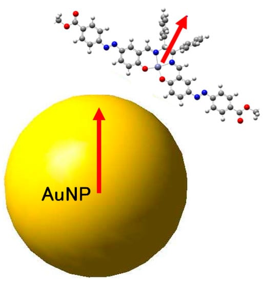 In the exciton framework [50], considering supramolecular chirality [51,52], dipole-dipole interactions of azo-compounds may be important for metal complexes’ chirality [53,54]. In the case of hybrid materials in polymer films, in which two components (and accompanying dipole vectors for these components) can freely rotate along the circumstance direction in the plane perpendicular to the light propagation vector, circularly polarized light could induce supramolecular chirality of the analogous metal complexes with azo-compounds [55,56]. In this case, the initial state of weak adsorption resulted in limited chiral metal complex motion. One vector (complex) can rotate in the plane AuNP’s surface, while another vector (AuNP) is fixed, because of its permanent nature, to approximately keep their orthogonality. However, “orthogonality” was still kept, treatment within the exciton framework can reasonably describe the spatial relationship and their spectral changes before and after linear UV light irradiation (Weigert effect). Therefore, as schematically depicted in Figure 13, the spatial relationship of chiral metal complexes (and its dipole moment) against (normal vector of) the surface of AuNP should be summarized according to experimental facts and an adaptable theoretical framework.