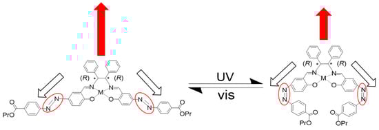 In order to clarify these differences before and after UV irradiation, Figure 10 summarizes the different spectra for the three complexes. Only for CuAz exhibited negative change (decreasing) of intensity for CD peaks, though spectral shapes (induced CD bands) were not similar to each other regardless of the identical ligand. Which may be attributed to the initial adsorption forms as well as slight differences in the coordination environments of metal complexes. As depicted in Figure 11 schematically, trans- to cis-photoisomerization of salen-type complexes resulted in different steric features of chiral complexes and their adsorption forms, as well as different electrostatic properties (decreasing of dipole moment). In contrast, trans-type Schiff base complexes may keep them or at least exhibit small differences because of their symmetry. Regardless, no complexes indicated CD bands before and after UV light irradiation for the present systems.