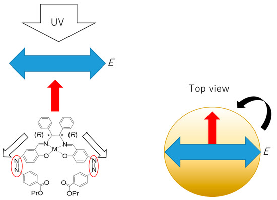 Contrary to the previous study with natural UV light [13], we employed linearly polarized UV light in this study. Similar to organic-inorganic composite materials containing a metal complex and azobenzene methyl methacrylate polymer (PMMA) cast films [36,37,38,39,40], anisotropic alignment of azo-compounds and coexisting molecules (Weigert effect [41,42]) can also be induced by linearly polarized UV light. By alternate irradiation of UV and visible light, selected photoisomerization resulted in anisotropic alignment of molecular long axis perpendicular to the electric vector of polarized light (Figure 12, left) [43,44,45,46]. Beyond the original Weigert effect, helical alignment of azo-compounds to induce CD bands of supramolecular chirality can be induced by circularly polarized UV light [47]. Hence, when chiral metal complexes (cis-forms) can be rotated on the surface of AuNP without changing angles between angles of AuNP (normal vector) and complexes (dipole moment) (Figure 12, right).