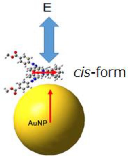 After (linearly polarized or at least non-polarized, namely natural) UV light irradiation, ligand azo-groups undergo photoisomerization to the cis-form accompanied by drastic change in the steric factors of chiral complexes. In addition to the intermolecular contacts caused by molecular shapes, this photoisomerization can result in drastic change in UV-vis and CD spectra around π-π* and n-π* bands. Indeed, three chiral complexes exhibited intense π-π* and n-π* bands and their changes for typical azo-compounds. However, such spectral changes cannot be regarded as characteristic proof of change of induced CD, because chiral metal complexes can exhibit spectral changes when they are permitted by sufficient space (free volume) or electronic states (typically “lacking” highly electron-withdrawing groups) for photoisomerization. Furthermore, photoisomerization potentially results in changes (decreasing) in the magnitude of dipole moment for chiral complexes. For direct contact and electrostatic dipole-dipole interaction mechanism, CD spectral changes can be proposed after photoisomerization, although only the latter influence (change of dipole moment) can be in agreement with the situation. Thus, the cis-form must be the predominant species on AuNPs after UV light irradiation.