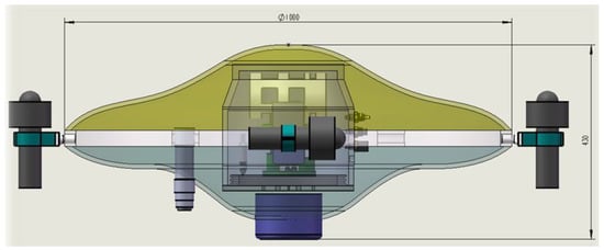 The structural design of the AUH is shown in Figure 1. This AUH could transmit data between base stations on the deep-sea bottom to communicate with scientific research ships near the free surface. The conceptual design of the AUH includes a symmetric, disk-shaped hull form, a pressure hull of 15 MPa, an energy power system, a control system, a navigation system, a communication system, and mission payload technology, e.g., recovering, landing, and launching models. The mission payload technology design in this study, i.e., airborne-launched technology, can enhance the effectiveness and efficiency of AUH missions. Thus, the study of the water entry impact forces on the disk-type AUH hull, with different water entry velocities and attitudes from a certain height, shall be carried out in this paper.