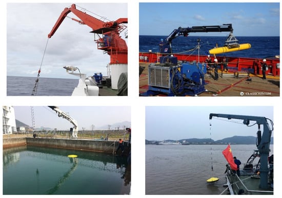 Scientific research ships can be mounted with several launch and recovery devices, including conventional crane forms, A-shaped cranes, dedicated single-arm cranes, sliding cranes, and integrated cranes. Conventional forms are advantageous because of their simple structures and low costs; however, the operation is complex, and they are not as safe. A-shaped cranes have been widely adopted because of their simple operation. Dedicated single-arm crane systems are very safe, as shown in Figure 2. They greatly simplify operation processes and save costs []; however, time-consuming deployment and its inefficiency to quickly launch multiple AUVs to target sea areas are its weaknesses. Sliding-type crane systems are mainly used to continuously lay equipment or different types of remotely operated vehicle (ROV) cables. An integrated layout and recovery system operates, more or less, independently from the scientific research ship and has a high safety factor. Deployment of AUVs is better from a submarine than from a scientific research ship; however, recovering the AUVs is difficult. USV- and UV-based deployments need further improvement in order to be practical and reliable [].