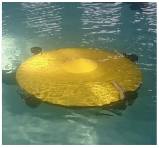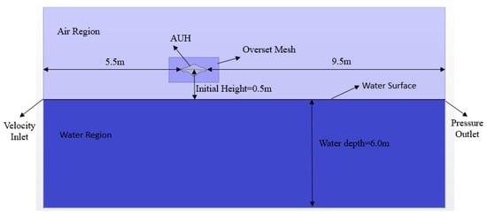 As shown in Figure 5, the computational domain for a steady, incompressible, two-dimensional flow of water with physically specified boundary conditions (BC) was identified. Two compounds were modeled in the flow field: Liquid water and air above the free surface of the calm sea. The AUH model was 1.0 m in diameter and 0.45 m in height. The coordinate origin was arranged at the center of gravity (CG) of the model. The computational domain was rectangular with the dimensions of , and the overset area near the AUH, where STAR-CCM+ overlapping grid technology was implemented, had the dimensions of . The velocity inlet was specified at 5.5 m upstream of the AUH bow. The pressure outlet was specified at 9.5 m downstream of the AUH. The initial height of the AUH model was specified as 0.5 m above the free surface, and the water depth was set as 6.0 m.