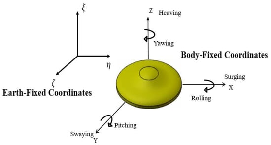 In this paper, research on simulated water entry impact forces of the hung, air-launched AUH was carried out. The main parameters of the AUH are shown in Table 1, and the disk-shaped AUH prototype in the test pool is shown in Figure 3. Both Earth-fixed and body-fixed coordinates were established to describe the water impact loads and motion of the AUH, as shown in Figure 4. In the body-fixed coordinates, the hydrodynamic forces (surge, sway, and heave) and moments (roll, pitch, and yaw) exerted on the AUH in six-degrees of freedom can be designated as X, Y, Z, K, M, and N, respectively. The impact forces on the AUH were estimated in the body-fixed coordinate in this study, including the surge force (expressed in terms of X-force) and heave force (expressed as Z-force).