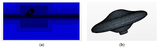 The CFD meshes could be divided into two categories: Structured meshes and unstructured meshes []. A hybrid mesh integrates structured and unstructured meshes to increase the mesh density near walls. In this paper, six hexahedron meshes were adopted by using a cutting mesh generator, and the total number of cells was . The encryption process of meshing the AUH required a minimum mesh size of m to ensure an accurate solution for the turbulence model that could meet y+ values greater than 30 []. It is worth mentioning that, to clearly simulate the variable process of AUH immersing into the water, meshing encryption at the air–water interface needs to be arranged, and connatural and miscellaneous dimensions need to be activated in the cutting mesh generator. The generated meshes of the two-phase flow and AUH are shown in Figure 6.