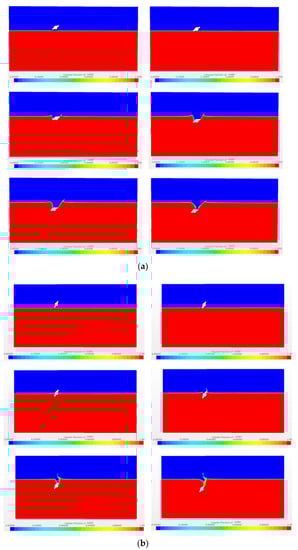 Two-phase flow simulation of the AUH at an initial velocity of 3 m/s with different immersion angles of 30° and 60°. (a) Immersion angle: 30°, initial velocity: 3 m/s; (b) immersion angle: 60°, initial velocity: 3 m/s.
