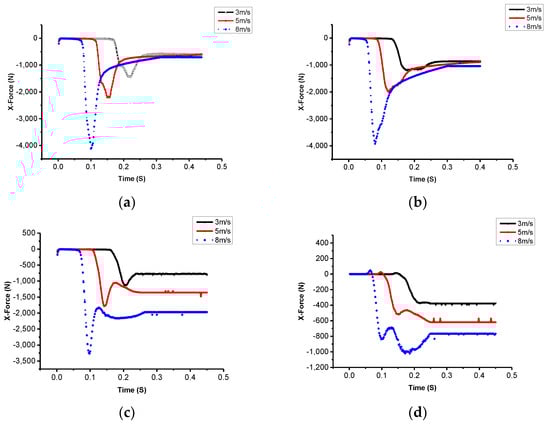 The variations of surge loads versus initial velocities of 3, 5, and 8 m/s at different immersion angles of 30°, 45°, 60°, and 90° over time. (a) Immersion angle: 30°; (b) immersion angle: 45°; (c) immersion angle: 60°; and (d) immersion angle: 90°.