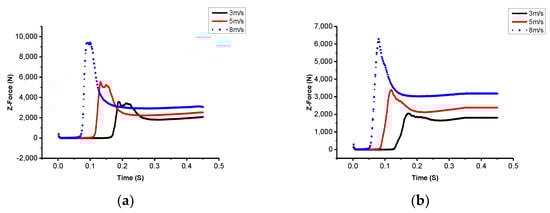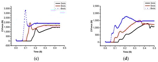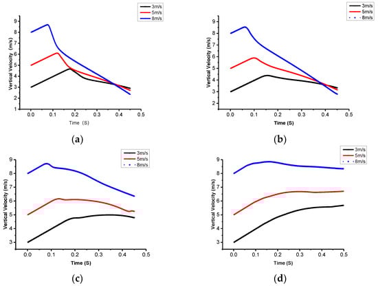 Figure 10a–d shows the speed changes under different immersion conditions. There was an initial acceleration process for a very short period because this is the free-falling motion of the AUH. The greater the initial velocity, the shorter the free-fall duration was; the greater the immersion angle, the shorter the free-fall duration was. Subsequently, as the AUH head entered the water, the velocity of the AUH decreased over time, and the greater the initial velocity, the greater the speed reduction. For instance, when the immersion angle of the AUH was at 30° and the AUH hull was completely immersed in water, the velocity reduced by 7.0, 4.3, and 2.7 m/s at 8, 5, and 3 m/s, respectively. The smaller the immersion angle, the greater the maximum vertical velocity that could be achieved. The larger the immersion angle, the smaller the vertical velocity change was, and the AUH quickly stabilized.
