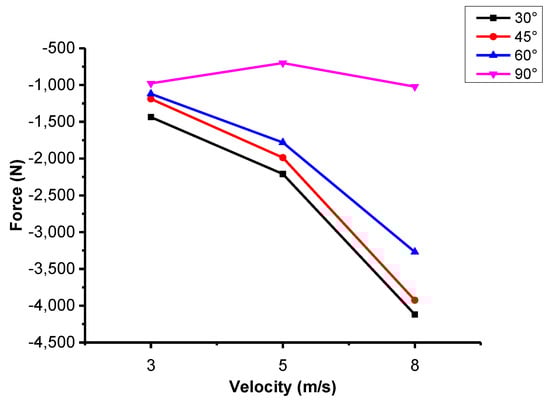 Figure 11 shows the peak values of the impact surge loads on the AUH at different immersion angles. At the same angle, the initial velocity was directly proportional to the surge load. When the AUH immersion angle approached 30° and the initial velocity was 8 m/s, the load was up to 4000 N, which would seriously impact the safety of the AUH and would even cause electronic components to fail. At the same initial velocity, the smaller immersion angle caused a greater surge load to be experienced. Therefore, the results suggest that, to avoid a small immersion angle and a greater speed to decreasing the damage, the AUH structure should be mounted with precise sensors.
