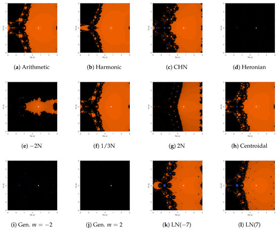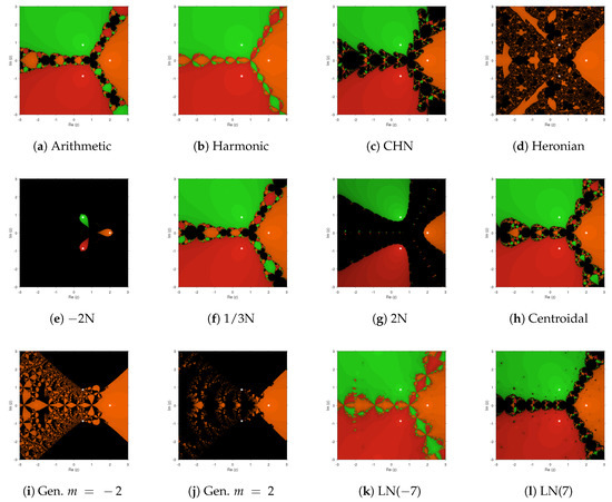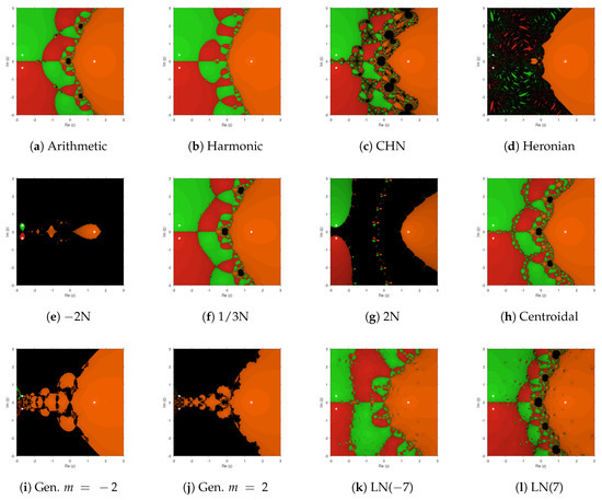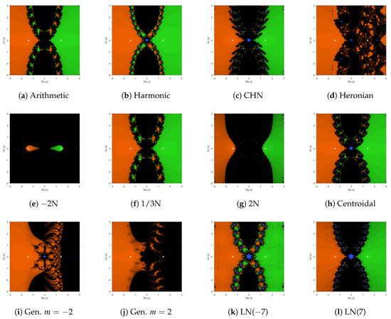 Regarding Figure 2, again Heronian, convex combination (), and generalized means showed convergence only to one of the roots or very narrow basins of attraction. There existed black areas of no convergence to the roots in all cases, but the widest green and orange basins (corresponding to the zeros of ) corresponded to harmonic, contra harmonic, centroidal, and Lehmer means.