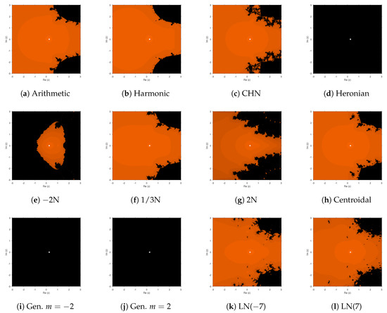 A similar performance is observed in Figure 4, where Heronian and generalized means with showed no convergence to only the root of ; meanwhile, the rest of the methods presented good behavior. Let us remark that in some cases, blue areas appear; this corresponded to initial estimations that, after 40 consecutive iterations, had an absolute value higher than 1000. In these cases, they and the surrounding black areas were identified as regions of divergence of the method. The best methods in this case were associated with the arithmetic and harmonic means.