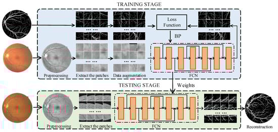 The new retinal vessel segmentation framework is shown in Figure 1, which consists of two stages. The first stage is the training stage, which consists of the following four steps: (1) preprocessing the retinal images; (2) extracting the patches by the dynamic extraction patch strategy; (3) inputting the patches to the fully convolutional neural network to extract features and classifications; (4) updating the network weights by the mini-batch Gradient Descent method and the backpropagation algorithm. The second stage is the testing stage, which also includes four steps: (1) the same data preprocessing method is used to process the test image; (2) the overlapping extraction patch method is used to extract the patches; (3) the patches are input to the fully convolutional neural network to extract features and classified to obtain segmentation patches; (4) the segmentation patches are reconstructed into target segmentation images by the overlap patch reconstruction algorithm.