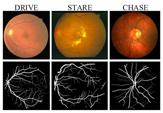 - Liskowski, P.; Krawiec, K. Segmenting retinal blood vessels with deep neural networks. IEEE Trans. Med. Imaging 2016, 35, 2369–2380. [Google Scholar] [CrossRef] [PubMed]