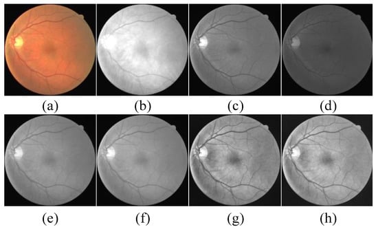 The first preprocessing strategy is to convert RGB images into single-channel grayscale images. Figure 3a–d shows that the original image and the converted single-channel grayscale image are red, green, and blue, respectively. By decomposing the RGB color image into three-channel monochrome images of red, green and blue, it can be seen that there is a higher degree of discrimination between the blood vessels and the background in the green channel, and the monochrome image of the red and blue channels has more noise and low contrast. Single-channel grayscale image shows better vessel background contrast than RGB images [19]. Therefore, the original RGB image is converted into a single-channel grayscale image by [22]. The conversion formula is as follows: